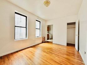 The apartment features hardwood floors throughout, a spacious living room, a queen-sized bedroom with a separate kitchen and living room.