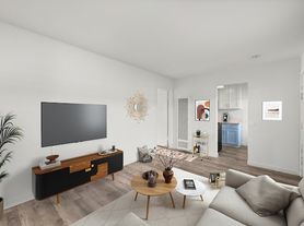 The living room offers a spacious open layout with large windows that bring in natural light and showcase the updated wood-style flooring throughout the unit. The neutral color palette and clean finishes make the space feel bright and inviting.