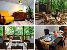 Fully stocked, gourmet kitchen upstairs and efficiency kitchen downstairs with a bbq outside on the deck. Gather in open living spaces or relax in the lush, green backyard on the decks or fire pit. Catch zzzz's on the chaise loungers on deck for a contemplative or collaborative experience with a lush green forest backyard.