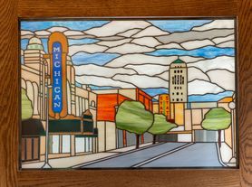 We built the outside to match the character of the Old West Side Historic District that surrounds it. Inside we built a studio apartment above a two-car garage that is 21st Century contemporary with an up-north flair. That includes a full kitchen, tile bathroom, walk-in closet with washer and dryer, large windows overlooking downtown Ann Arbor, and a stained-window framed by the front door.