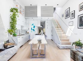 Not an expense was spared in this thoughtfully planned and masterfully renovated home by renowned architect Greg Sharp and Case Development in 2018, this indoor-outdoor jewel box delivers a quiet, meditative ambiance where soaring ceilings rise over soundproofed white oak floors. The main level welcomes you with skylit open-plan living and dining areas flanked by a dramatic wood-burning fireplace. Calacatta marble detailing unites the double-height living spaces with the open gourmet kitchen anchored by a long waterfall island/breakfast bar. Sleek floor-to-ceiling cabinetry and shelving surround elite appliances, including a vented Viking range, microwave and French door refrigerator. Greek marble adorns the full guest bathroom on this level, while the rear-facing secondary bedroom features a built-in Murphy bed and a wide private terrace overlooking leafy treetops and townhouse gardens.