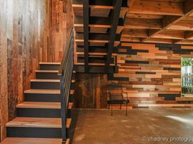 The first floor features radiant floor heating and an open layout that's perfect for relaxing. Upstairs, you'll find vintage hickory wood floors, a bright kitchen with stainless steel appliances, quartz countertops, custom cabinetry, and a stunning copper backsplash. The bathroom is filled with natural light and includes a marble-top vanity. A full-size washer and dryer are also included for your convenience.