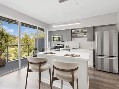 Open-concept kitchenPrivate balconyEating barStainless appliancesPrimary walk in closet