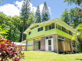2 Bedrooms and 2 full bathrooms. . Ground floor apartment for rent in beautiful tropical jungle property in Hana, Maui. Approximately 800sq ft interior plus 250sq ft screened in cement front patio. Large yard in a quiet agricultural neighborhood. 5 minutes from the school and 10 minute drive from Hana town center. There is room for 2 cars to park in the gravel parking area just outside the front door. The entire apartment was remodeled in 2022- all new bamboo flooring, drywall, paint, new appliances (fridge with top freezer, electric oven and stove top, large washing machine and dryer), new on demand water heater and addition of the screened in cement patio. Both bathrooms have stand up showers. One bathroom is in the house in the hallway between both bedrooms. The other, master bath, privately enclosed and screened in, is just off the master bedroom, accessible through the back patio sliding door. The apartment comes partially furnished, if desired (furnishings can be removed if you have your own and don't want ours). Washer and dryer on site are shared with upstairs tenant.