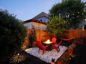 Private, fully landscaped backyard with seating, fire pit, hammock, and BBQ