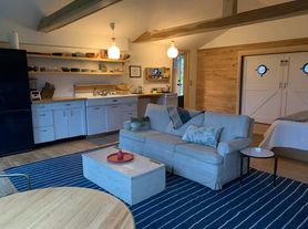 The Carriage House has his own entrance from the driveway and backyard. Designed to feel like quarters on a boat, there are two porthole windows near the plush king bed. A full kitchen includes an oven, stove, Vitamix, French press, full size refrigerator, and vintage enamel sink. Our pots and pans include Le Creuset, Mauviel, and Dansk. The living room has an obstructed views of the ocean with a dining table for two. The bathroom has a granite shower base with Heath, ceramic tiles, washer, and dryer, which can be run at night with the door closed for Sound. A selection of books can be enjoyed, including a local favorite, the lost kitchen cookbook. The large backyard has ample areas to relax, grill, sit out under the stars.