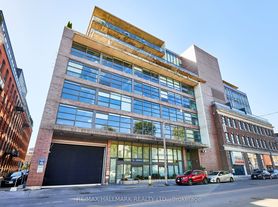 The Ninety - classic modern loft design. Balcony has hookup for gas BBQ. Spacious 1 bedroom unit with 9 ft exposed concrete ceilings & walls and hardwood floors throughout. Stylish European kitchen with stainless steel appliances, gas stove, ensuite laundry. Ideal east side location, with a quick walk to restaurants + shops in Leslieville, Distillery District, and easy access to highway and transit.