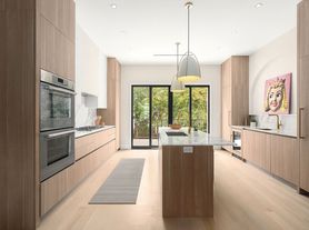 The open-concept kitchen is a culinary dream, featuring quartz countertops, a striking waterfall island, and a premium suite of appliances: six-burner Wolf gas stove, integrated French door refrigerator, microwave, integrated dishwasher, pot filler, and farmhouse sink. There is custom cabinetry on both sides of the kitchen. Full-glass doors open to a spacious parlor deck, ideal for entertaining and overlooking a peaceful, landscaped garden.