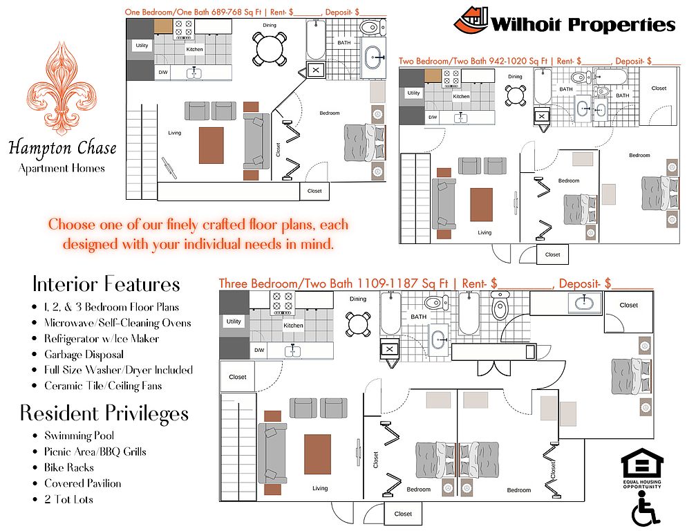 1, 2, & 3 bedroom units, with washer and dryers in the units. Fully furnished kitchens--Microwaves, refrigerator with ice maker, disposal, range and dishwasher. Pool and playgrounds.