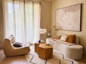 The south-facing living room is the heart of the home, where oversized Pella windows and 9-foot ceilings create a bright, airy atmosphere all day long. White oak floors extend throughout, and a private balcony offers the perfect setting for morning coffee or quiet evenings outdoors. This residence can also be delivered fully furnished, making it effortless to settle in and enjoy.