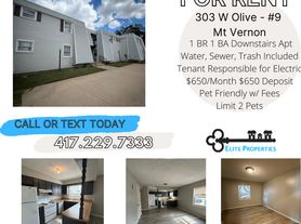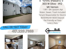1 bedroom, 1 bathroom 1st floor apartment in Mt. Vernon. Water, sewer, trash included. All electric. Off-street parking. No laundry facilities. Pets allowed- 2 pet limit and additional fees. Message for showing instructions or link for application. No prior evictions or felonies. Income requirements: 3x rent net income or 2.5x for fixed income. All Elite Properties applications are good for 90 days for any properties within your approval amount.