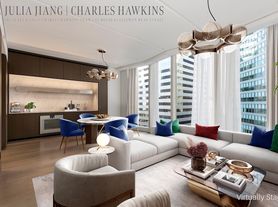 Enter into this spacious corner living and dining room outfitted with Carlisle, oversized wide-plank white oak flooring, floor-to-ceiling Starphire UV-coated windows, Automatic Blackout window treatment, and nearly 10-foot ceilings.