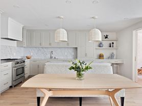 The renovated kitchen boasts an expansive island and dishwasher. The primary king-size bedroom features an en-suite bathroom, and the second bedroom offers space for a bed and office setup. Additionally, the unit features a washer/ dryer.