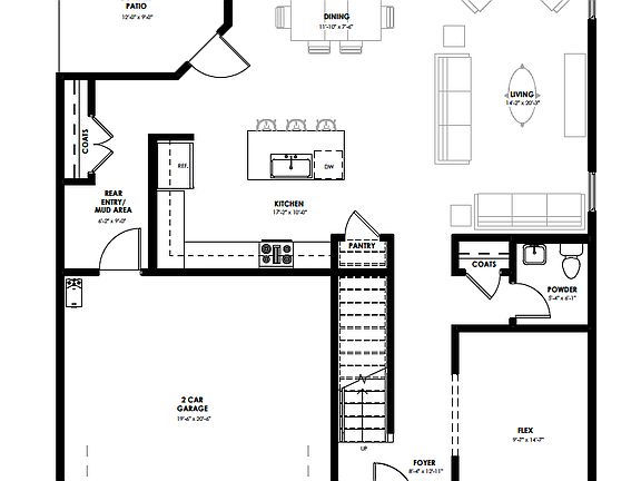 The main level features a wide-open layout connecting the living room, dining area, and a large kitchen with island, pantry, and plenty of counter space. A dedicated flex room off the foyer works as a home office, playroom, or formal living space - your call. The rear entry mud area keeps the daily mess contained, and a covered patio off the dining room extends your living outdoors. A powder room and two-car garage complete the first floor.