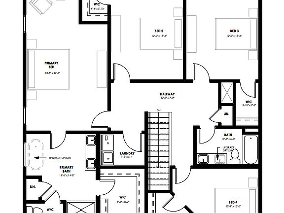 Upstairs, the primary suite is a true retreat with a 13x17-foot bedroom, oversized walk-in closet, and a spa-inspired en-suite bath with upgrade options. Bedrooms 2 and 3 are generously sized at 12x15 feet each, while Bedroom 4 offers additional flexibility. Every bedroom includes a walk-in closet. The upstairs laundry room and linen storage keep daily life running smoothly.