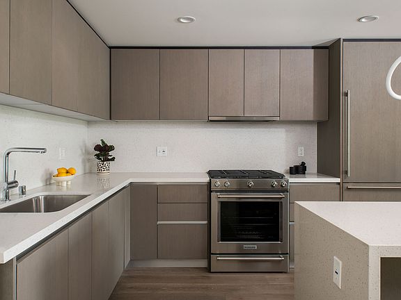 West-facing balconiesOpen-concept kitchenItalian kitchen design cabinetryGrohe fixturesRecessed lightingGenerous kitchen island
