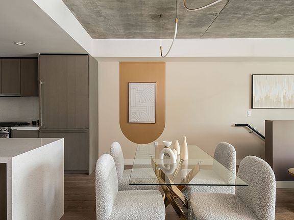 This floor plan for Townhomes 409-413 features a sophisticated two-level, 2-bedroom, 2-bathroom layout, offering expansive indoor-outdoor living with two west-facing balconies. Meticulously crafted with Italian Kitchen Design cabinetry, a generous kitchen island, Grohe fixtures, and recessed lighting, the residence is centered around an open-concept kitchen, dining, and living area. Residents will enjoy convenient access to the Level 5 Amenity Deck, offering a resort-style experience including pool, spa, firepit, and Community Lounge.