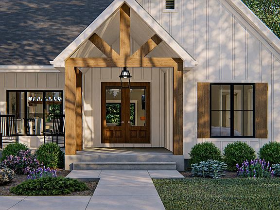 The Holly is a gorgeous Modern Farmhouse with board-and-batten siding, highlighted by wood beams and metal roof accents. A covered front porch with a cathedral ceiling welcomes you inside to an inviting entry with exposed beams. Just off the foyer is a formal dining room, perfect for entertaining. The great room features a soaring cathedral ceiling, cozy fireplace, and built-in bookshelves. The kitchen offers a large island and walk-in pantry, with the private owner's suite tucked behind it. The owner's suite includes a tray ceiling with beams, a spacious walk-in closet, and a bath with a soaking tub separating dual vanities plus direct access to the laundry room. On the opposite side are three additional bedrooms-one with a private bath and two sharing a full bath.