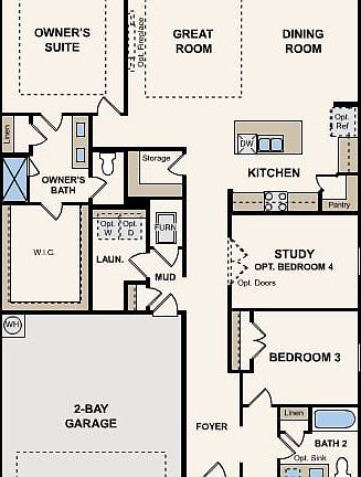 The attractive Erie plan offers an open-concept layout at the heart of the home, showcasing a large kitchen with a walk-in pantry and a center island overlooking a sunlit great room and a dining area. The primary suite is adjacent, featuring an oversized walk-in closet and an attached bath with a walk-in shower. Toward the front of the home, you'll find a private study and two secondary bedrooms flanking a bath. Options Include: Separate tub and walk-in shower at primary Covered patio or extended covered patio off dining room Powder bath near laundry