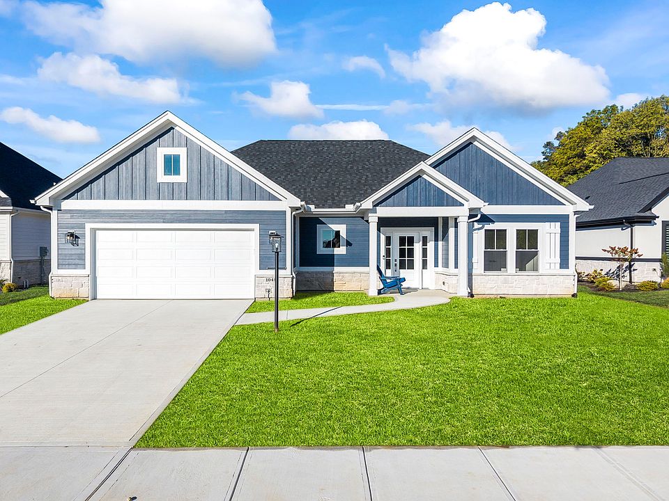 The Lincoln blends comfort and style in a smart, open-concept ranch design. A bright foyer leads into a spacious great room filled with natural light, anchored by a beautiful stone fireplace with custom built-ins and floating shelves. The kitchen is a showpiece with a large island, quartz or granite countertops, decorative range hood, and stainless steel appliances, flowing effortlessly into the dining area and covered patio for easy entertaining.