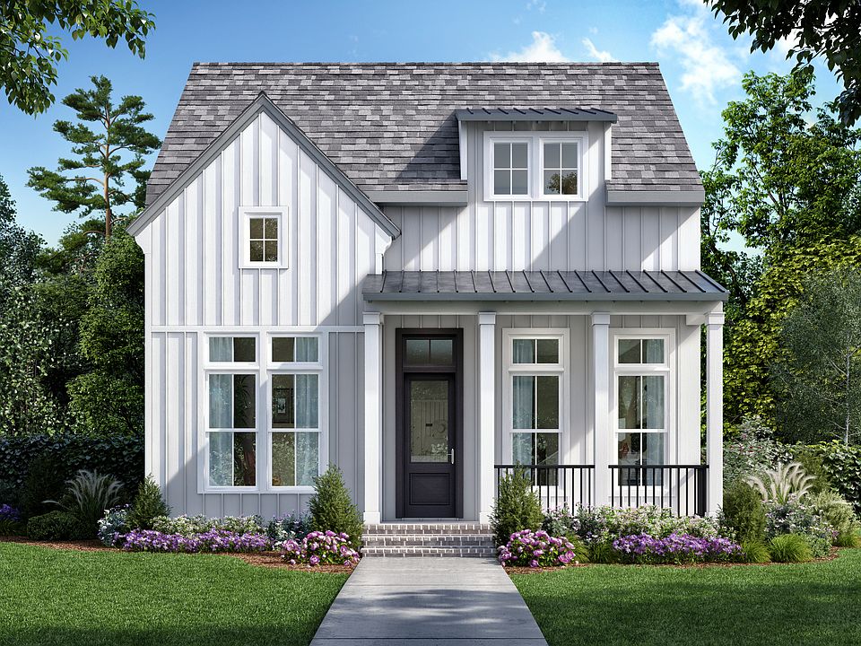 The Jack elevation shines with true modern farmhouse fashion. The board and batten siding, in your choice of colors, highlights the roof's height. It pairs beautifully with the detailed porch railing, while the windows add an elegant touch. A shed dormer window along the roofline compliments the metal roof accent perfectly.