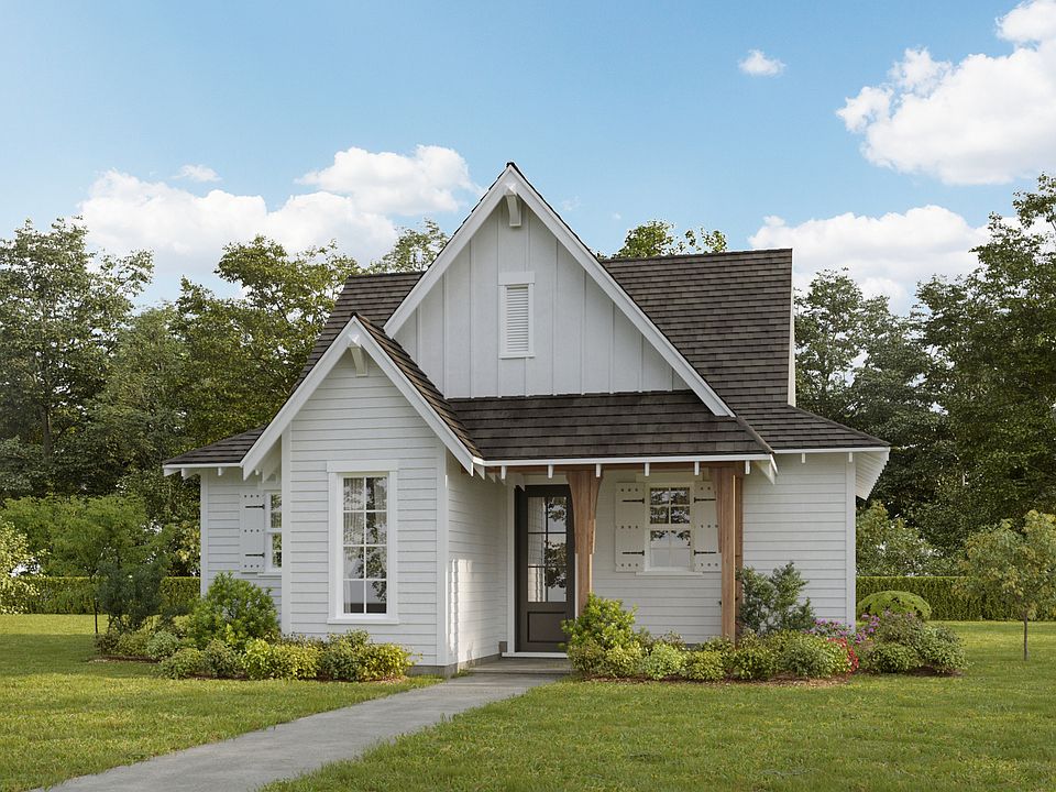 The Telford is a two bedroom, two bathroom, 1255 square foot home. From the covered front porch, the entrance welcomes guests into the open concept kitchen and dining room. The kitchen features a large center island and two pantries.The laundry room is located at the front of the home off the kitchen. The dining room flows into the spacious living room that features large windows. The primary suite rests on the back of the home and features a large bedroom and en suite bathroom with a large walk-in closet. The Telford features a second bedroom and bathroom on the front of the home.