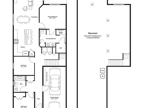 Aurora features 1,594 square feet under air, 2 bedrooms, 2 bathrooms, a versatile flex room, a 2-car tandem garage, and a basement with options to finish.