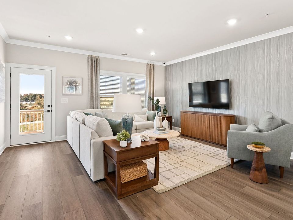 Sip your morning coffee from the second-story balcony. Inside, the kitchen boasts ample counter space and a large island. Useful flex space makes a great office or extra bedroom. In the owner's suite, dual sinks and a large closet add convenience.