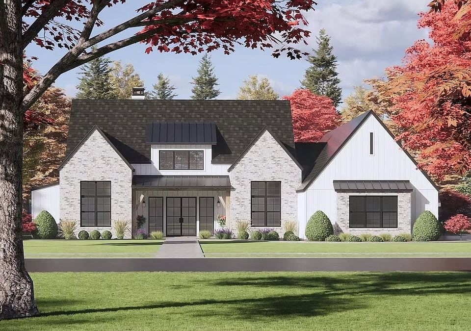 A stunning modern farmhouse showcases exceptional craftmanship and thoughtful design. The exterior blends timeless white siding with natural stone accents creating a perfect balance of warmth and sophistication.