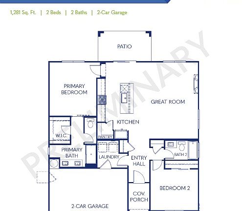 Plan 1281 is a charming single-level home with impressive curb appeal and a welcoming entrance. The kitchen seamlessly connects to the great room and dining area, showcasing a stylish center island and a generous walk-in pantry. The serene primary suite is separated from the secondary bedroom and includes a walk-in closet and a bathroom with double sinks. Covering 1,281 square feet and designed for optimal livability, it features a spacious laundry room and mudroom accessible upon entering from the garage. This home is ideal for first-time buyers or those looking to downsize, offering a perfect blend of comfort and convenience.