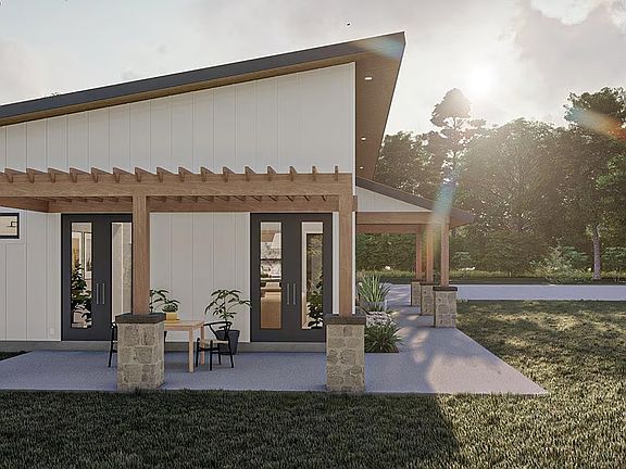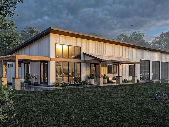 Discover the perfect blend of luxury and sustainability in this stunning 4-bed, 2-bath, 1,982 sq. ft. barndominium-style home set on 10+ acres of individually deeded land. Built with conventional 2x6 wood framing, this home exudes modern elegance with an open-concept design. The great room's soaring ceilings, statement fireplace, and French doors create an inviting space that flows seamlessly into the chef's kitchen, complete with a walk-in pantry and oversized island.