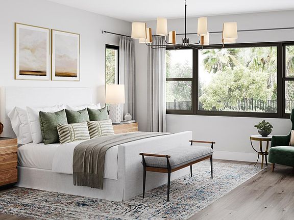 The Springs residence offers a luxurious blend of comfort and style in its thoughtfully designed two-story layout. Upon entering through the grand foyer, you're greeted by an open floor plan that seamlessly connects the two-story great room, kitchen, and casual dining area. The gourmet kitchen boasts a large center island and walk-in pantry, perfect for culinary enthusiasts. A first-floor bedroom suite and adjacent flex room off the foyer offer additional living and entertaining space. The primary bedroom suite, conveniently located on the main floor, features dual walk-in closets and a spa-like bathroom with dual vanities, a freestanding tub, and a private water closet. The second level impresses with a versatile loft space, three additional bedrooms with walk-in closets, three full baths, and a large bonus room. Indoor-outdoor living is effortlessly achieved with a lanai accessible through multi-slide stacked doors, while a two-story porch adds architectural interest to the exterior.