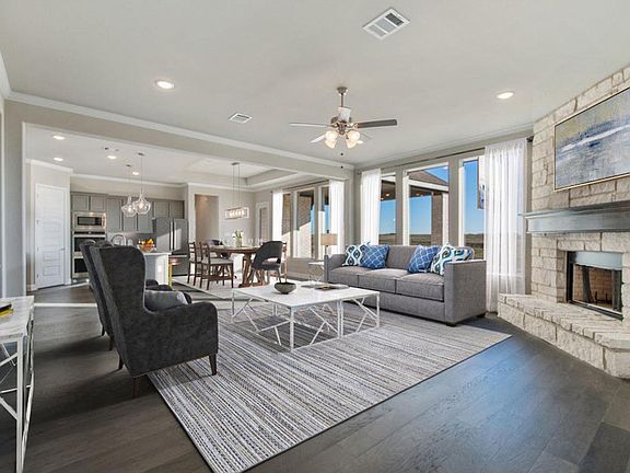 This spacious home features an open layout with the kitchen, breakfast nook and family room (with an optional fireplace) offering views of the backyard.. The kitchen features granite countertops and stainless steel appliances. The primary suite boasts a large walk-in closet and a luxurious bathroom. Three bedrooms share a full bathroom, with an option for a game room. A flex room can be a fifth bedroom with a full bathroom. Ample storage, a utility room and optional garage upgrades complete the home.