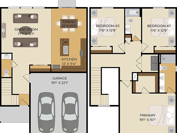 The 1926 floor plan offers a spacious and well-balanced design with an open main level that brings the great room, kitchen, and dining area together for easy everyday living. The kitchen features ample counter space, a central island, and direct access to the patio, making it ideal for both entertaining and casual meals.
