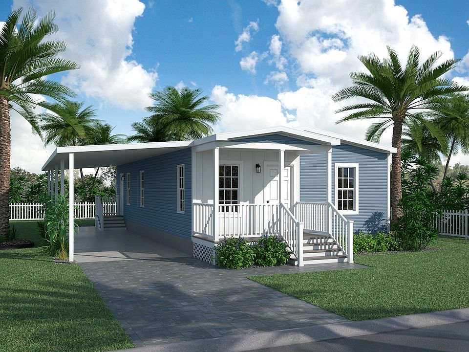New 2-bedroom, 2-bath manufactured home with a modern open layout. Features include vinyl flooring throughout, a farmhouse-style stainless steel kitchen sink, and black matte faucets and fixtures for a sleek, contemporary look. Please note: photos are renderings and may not reflect the final product. Contact us for details and pricing. Located inside a 55+ community. EHO