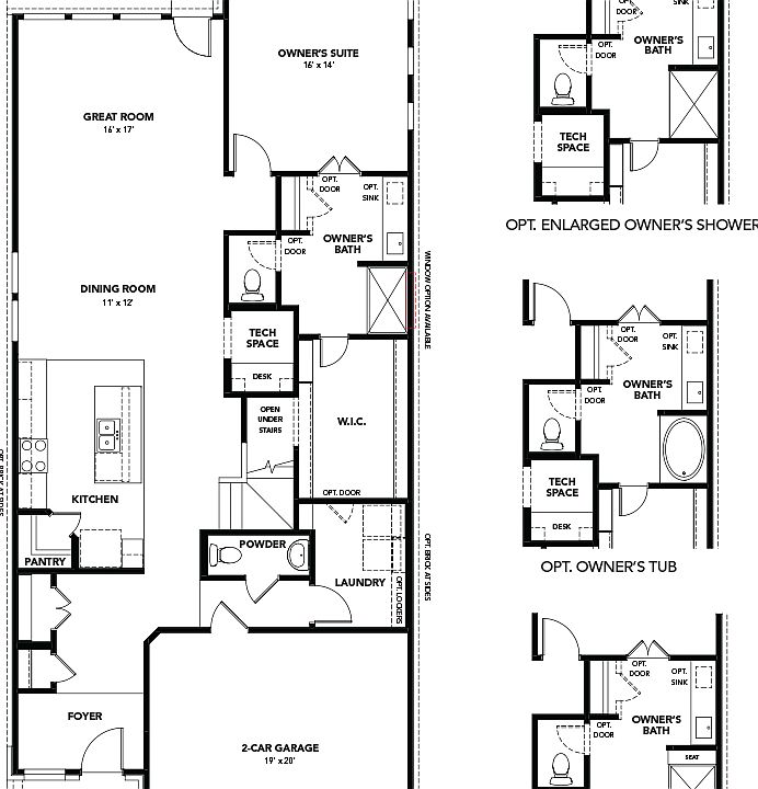 The private primary suite is located on the first floor, providing a quiet retreat with a generously sized bedroom and private bath. Choose to add a door from the closet to the laundry room to make laundry day a breeze. A nearby tech space offers additional versatility and can serve as a home office, reading nook, or hobby space, depending on your lifestyle.