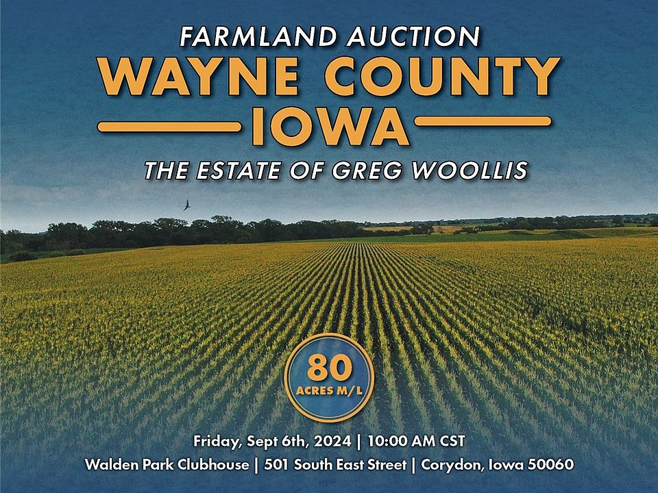 This farmland tract will be offered via a live Public Auction that will take place at 10:00 AM CST on Friday, Sept 6th, 2024, at the Walden Park Clubhouse (Corydon Golf Course) located at 501 South East Street in Corydon, Iowa. The land will be sold as one tract on a price-per-acre basis. This auction can also be viewed through the Peoples Company mobile bidding app and online bidding will be available.