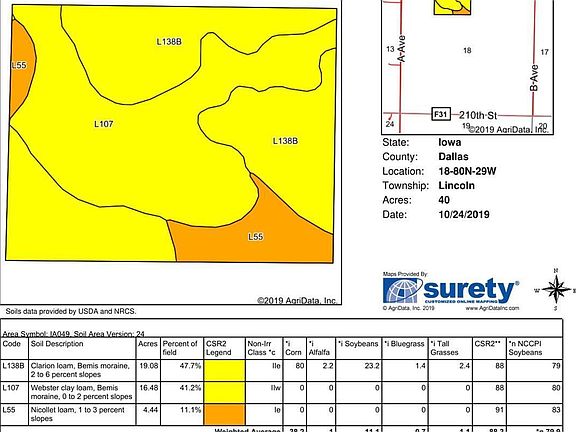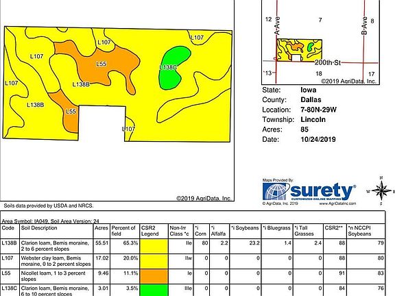 Great oppurtunity to own high quality Dallas County farm land. Can be bought in two different parcels as either 85 M/L acre or 40 acre M/L.