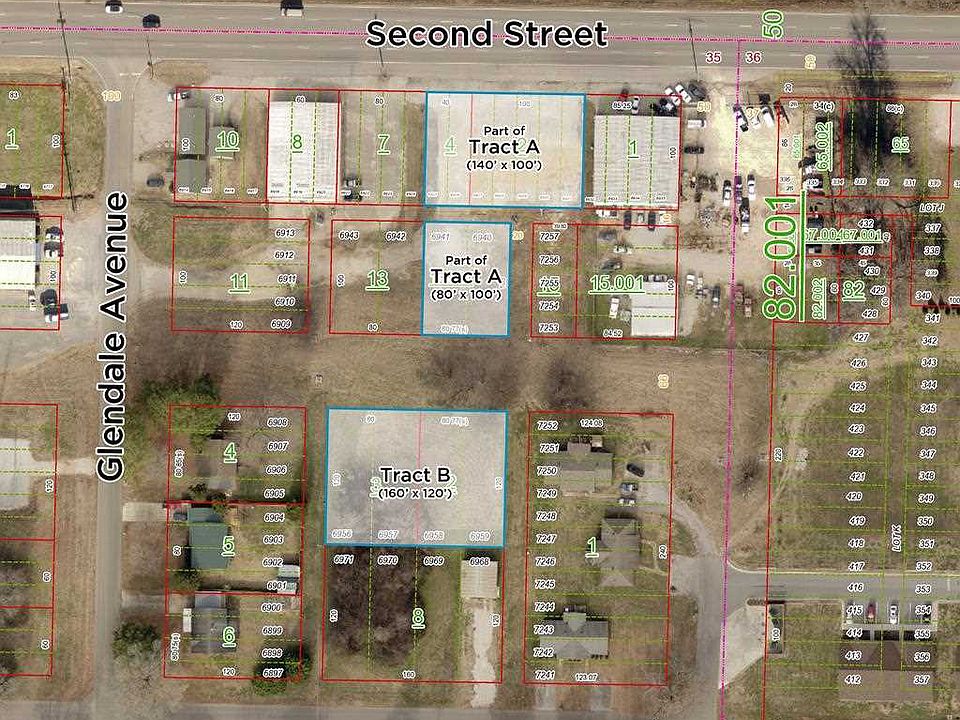 Level commercial site on Second Street in Muscle Shoals, Alabama includes 140' of frontage and 100' of depth, with an additional 80' by 100' lot to the rear (both identified as Tract A on the attached image). An additional 0.44-acre parcel nearby (identified as Tract B) is also available.