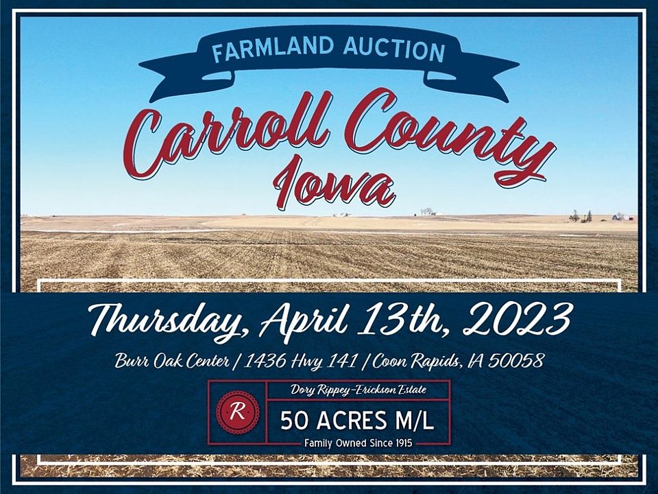 Carroll County, Iowa Land Auction – Mark your calendar for Thursday, April 13th, 2023 at the Burr Oak Center in Coon Rapids, Iowa! I'm pleased to represent the Dora Rippey-Erickson Estate in the sale of 50 total acres m/l of prime Carroll County, Iowa farmland. This property has been in the Rippey family since 1915, surpassing the 100-year mark and the coveted ‘Century Farm’ status. As farmland ownership continues to be long term, this is a rare opportunity to own land that hasn’t been on the market for generations and is located in a tightly held area.
