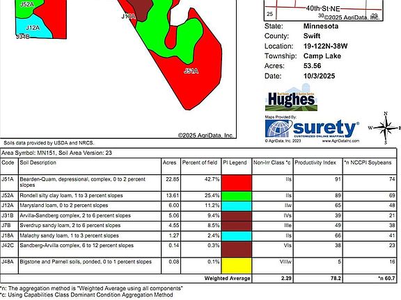 Online only land auction January 12-16, 2026. 114.72 Acres located in Section 19 of Camp Lake Township, Swift County, MN. Total tillable acres are 82.59 including 29.63 enrolled in CRP through 9/30/2027. Annual CRP payments of $5,383 plus additional income from the 52.96 acres of currently tillable cropland. Also included are approximately 31 acres of woods/hunting land. Great income/recreational property!