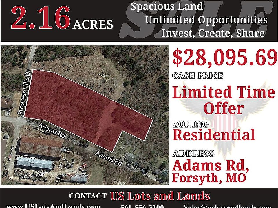 2.16ac Very close to Downtown Branson ~~ Contact US Lots and Lands to learn more: 561-556-3100 - Sales@uslotsandlands.com ~~ WHY BUY?: #1. Live minutes from the beautiful Lake Taneycomo with a public boat launch only a mile away! #2. Priced for a quick sale! #3. You are NOT going to want to miss this one, buy with $28,095.69! Multiple Purchase Options Available! COMMUNITY DETAILS: This land sits in a very quiet neighborhood that is perfect for raising kids or an Airbnb/V.R.B.O! This homesite sits in a private location that backs up to a wooded area, which allows you to enjoy the wildlife as a neighbor! And it is minutes from the variety of amenities in downtown Branson, Forsyth Middle and High schools as well as fire and police stations. Also, this property is only 1 hour from Springfield and about 2 hours from Joplin. Come turn this space into a home or fantastic investment! USAGE DETAILS: - Single Family Home PROPERTY DETAILS: - Lot Type - Land - Sale Price - $28,095.69 - State - Missouri - County - Taney - Assessor's Parcel Number - 04-9.0-32-001-015-001.000 - Property Usage - Single Family Home - Property Address - 0 Adams Rd, Lot #: 1, Forsyth, MO 65673 - Size - 2.16 Acre(s) - Road Access - Yes, Paved - Electricity - At the Street - Water & Sewer - City connections ACCESS DETAILS: - Adams Rd is a paved road - Lot GPS Coordinates: 36.689241, -93.117495 - 208 Adams Rd is the address to the neighbor's house, which is adjacent to the lot. POPULAR ATTRACTIONS: - Branson Zipline at Wolfe Mountain, 25 minutes away - Everyone will have an absolute blast snow flex tubing and it’s a great place to zipline too! - Branson RecPlex, 31 minutes away - Such an awesome place to sign up your kids for sports or to watch them. - Table Rock State Park, 34 minutes away - This is one of the best places to walk along the hiking trails, as you can see great views of the lake. PURCHASE OPTIONS: Build your dream home without breaking the bank, buy with $28,095.69 cash! Other payment options available. GOT QUESTIONS? WE HAVE ANSWERS!: - Call/Email US Lots and Lands @ 561-556-3100, Sales@uslotsandlands.com - We may have other properties at bargain prices available. All you have to do is ask! - Don’t hesitate! Connect with us today while this deal is still Available! DISCLAIMER: Buyer must verify & work with County to know what can & can't be done with the land, obtain proper permits if needed & confirm the availability of any utilities needed/serviced on the lots. Seller makes no warranties or representations about the land, its condition, or what can be built on the parcel.