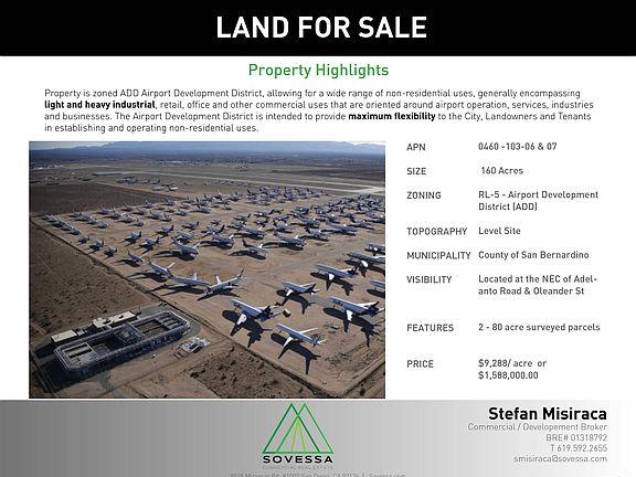 160 Acres of commercial land. This site located in the path of growth 2 miles to the north of SCLA and has several factors making this a desirable strategic asset that will appreciate well into the future. Goldman Sachs Renewable Power has acquired 670 acres for a 100MW solar PV plant with a 50MW battery storage facility currently under operation. The property is in the County of San Bernardino near the city of Adelanto ADD Airport Development District, allowing for a wide range of non-residential uses, generally encompassing light and heavy industrial, retail, office and other commercial uses that are oriented around airport operation, services, industries, and businesses.