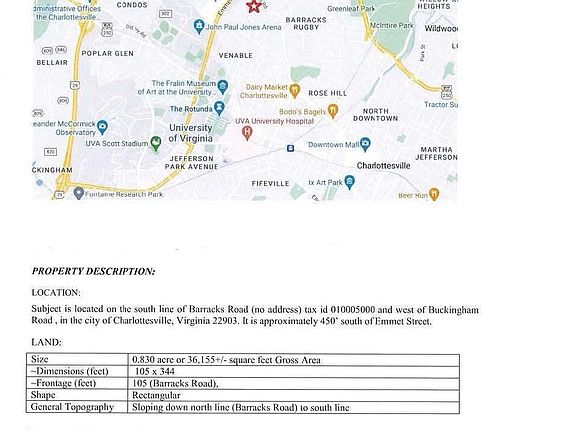 Meadowbrook/Barracks/UVA - Exceptional 0.83 acre city parcel within walking/biking distance to UVA, Barracks Road Shopping Center and many other services. The city of Charlottesville confirmed the lot size and street frontage width is sufficient to divide the lot by right. In order to split the parcel, a minor subdivision would be required. Both lots are buildable. Zoned R-B - A base of 6 units per lot for a total of 12 units are allowed. With a bonus for affordable housing, the total of allowed units increases to 24. Purchaser is responsible for lot division. Barracks Road is upgrading to include a bike lane. A 20' deep portion of the land for sale abutting Barracks Road will be purchased by the city to accommodate the bike lane. With a walk score of 59, most services are available within a few blocks. Additional documents are available. This is an amazing opportunity.