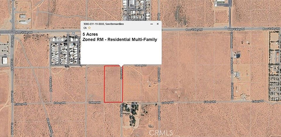 ***Come VIEW and Make an OFFER TODAY! MULTI-FAMILY LAND OPPORTUNITY located in the heart of expanding Apple Valley CA. The 5 ACRE lot is zoned RM - Residential Multi-Family, allowing for 2 TO 20 UNITS PER ACRE. With the potential of building up to 100 units, the site is ideal for any developer or savvy real estate investor. Situated right in the path of growth the property blends the best of urban and rural settings, plus all kinds of new developments are sprouting up nearby. Not to mention utility lines run adjacent to the site. Seize the chance to develop in an area desperately needing new housing inventory. A definite must see opportunity before it's to late***