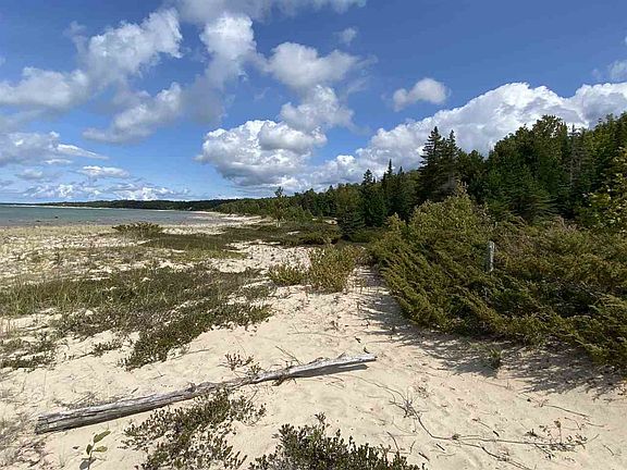 West Side Lakefront Acreage Parcel Parcel #13 of the original Bonner’s Landing Acreage Parcels, PLUS an additional 2.8 Acres and 109.79 feet of frontage added to it – for a total of 14 Acres and 327 feet of lake frontage. This one-of-a-kind chunk of acreage lays against a State of Michigan 72 Acre Parcel at the south end of Eagle Bay and just a half mile south of the Barney’s Lake Nature Preserve of Little Traverse Nature Conservancy. The main treeline of this 14 Acre Parcel is well inland of its shore frontage so that your home or cottage would have a wonderful view of the open dunes out front. See the setting sun and moon on the water from your homesite on this property for about nine months of the year – and for the whole year when you are out at the beach’s edge. It is just a 4.5 mile drive to the Town of St. James on Beaver Harbor. It is priced at $300 per front foot LESS than most of the sandy beach frontage on the Island is priced. Asking price is $499,000.
