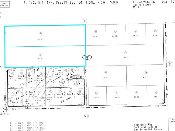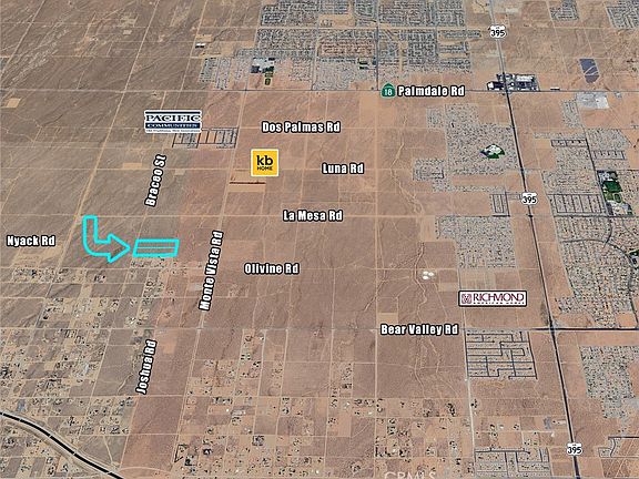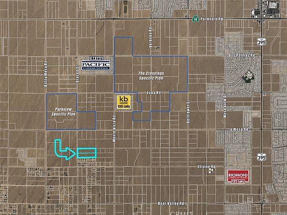 20 ac R-1 Land in the Path of Development. In this area of West Victorville, KB Home has broke ground on a 40 ac Tract (135 lots) at Monte Vista Rd & Luna Rd, Pacific Communities has almost completed their Model Homes and is currently constructing about 17 additional homes at Monte Vista Rd and Dos Palmas Rd (185 lots), and Richmond American has broke ground at Olivine & Mesa View (122 lots). Current projects are the first movement seen since 2008 in this area. Multiple projects also working on Tentative Maps. All great signs pointing towards the development of this area. The subject property. Parkview Specific Plan (owned by the Lewis Group), is located directed North and has plans for 715 homes, a 10 ac park, an 11 ac commercial center and a 12 ac school site. Snowline School District owns an adjacent 10 ac. Great opportunity to acquire land in West Victorville before development eventually takes off.