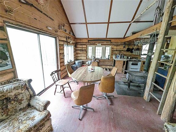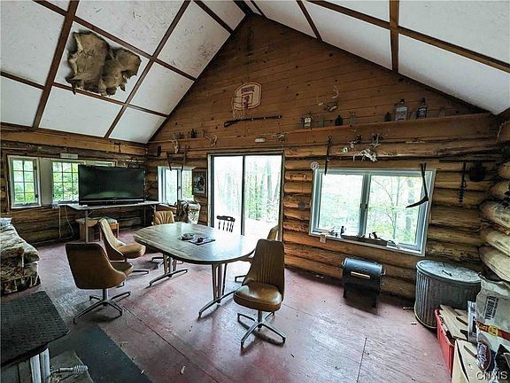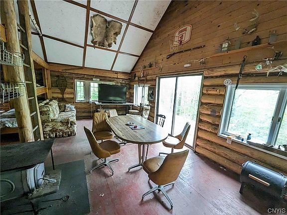 This cozy log cabin provides a great place to get dry and warm up after a long day of hunting. Enjoy warming up around the wood stove that provides heat to the fully-functioning cabin. The cabin has been wired and electricity is provided by a generator. There is a small kitchen with a propane stove and a large open living area with vaulted ceilings for entertaining. A sliding glass door leads to the large deck on the back of the cabin and overlooks the forest. The main floor has one bedroom consisting of two bunk beds with additional sleeping space in the loft.