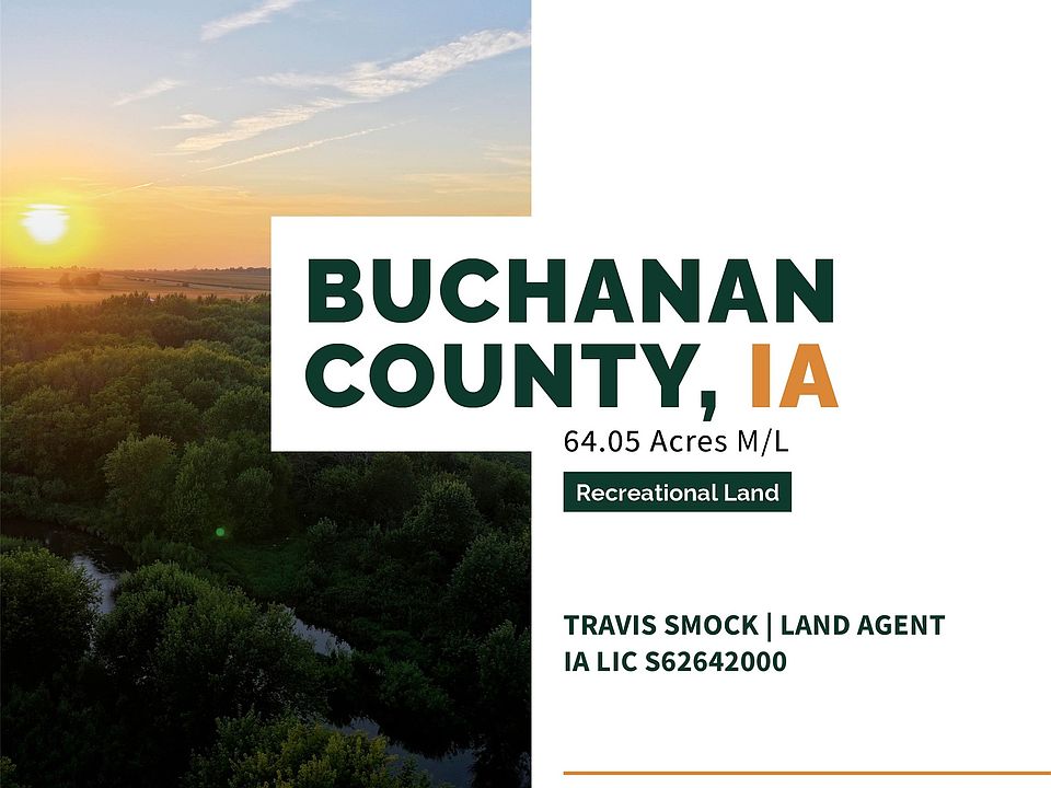Presenting 64.05 acres m/l of beautiful recreational land located just southeast of Winthrop in Buchanan County, Iowa. This diverse property offers a unique combination of timber, open areas, and a year-round water source with Buffalo Creek winding through the land. The creek and surrounding habitat create an ideal environment for deer, turkey, upland birds, and other native fauna, making it an excellent opportunity for hunting, wildlife observation, and outdoor recreation. Income is provided by a CP22 Riparian Buffer CRP contract that pays $2,103 annually and expires in 2032. In addition to the 23.95 acres enrolled into CRP, there are 5.36 FSA cropland acres in an open field that could be leased, farmed, or planted to an ideal food plot area.