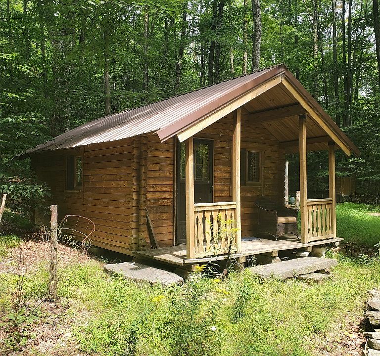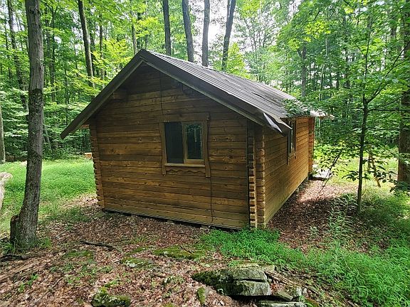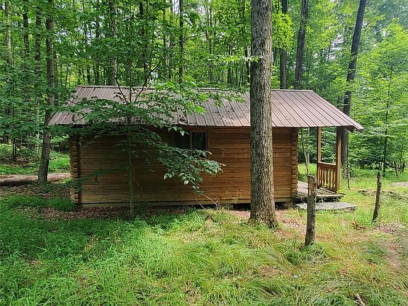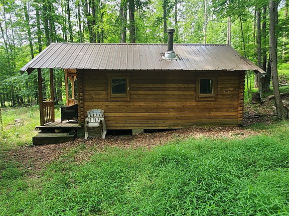 Hermits Cabin. One room log cabin tucked in the woods. Vaulted ceiling. Wood heater. Full front porch. Metal roof. 5.00 surveyed acres+-. Long road frontage. Located on a township maintained dead end road. No well or septic. Electric lines on property. Includes all oil, gas and mineral rights. Excellent hunting in area. Beautiful property to build your new home on or getaway retreat.